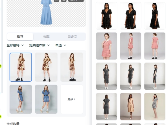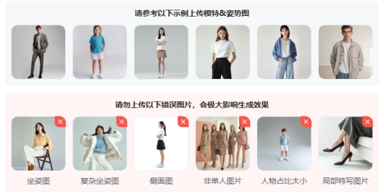 如果你对预设模特不满意,还可以选择自定义模特,上传自己的真人模特照片,让AI将新服装换到自己的模特身上。