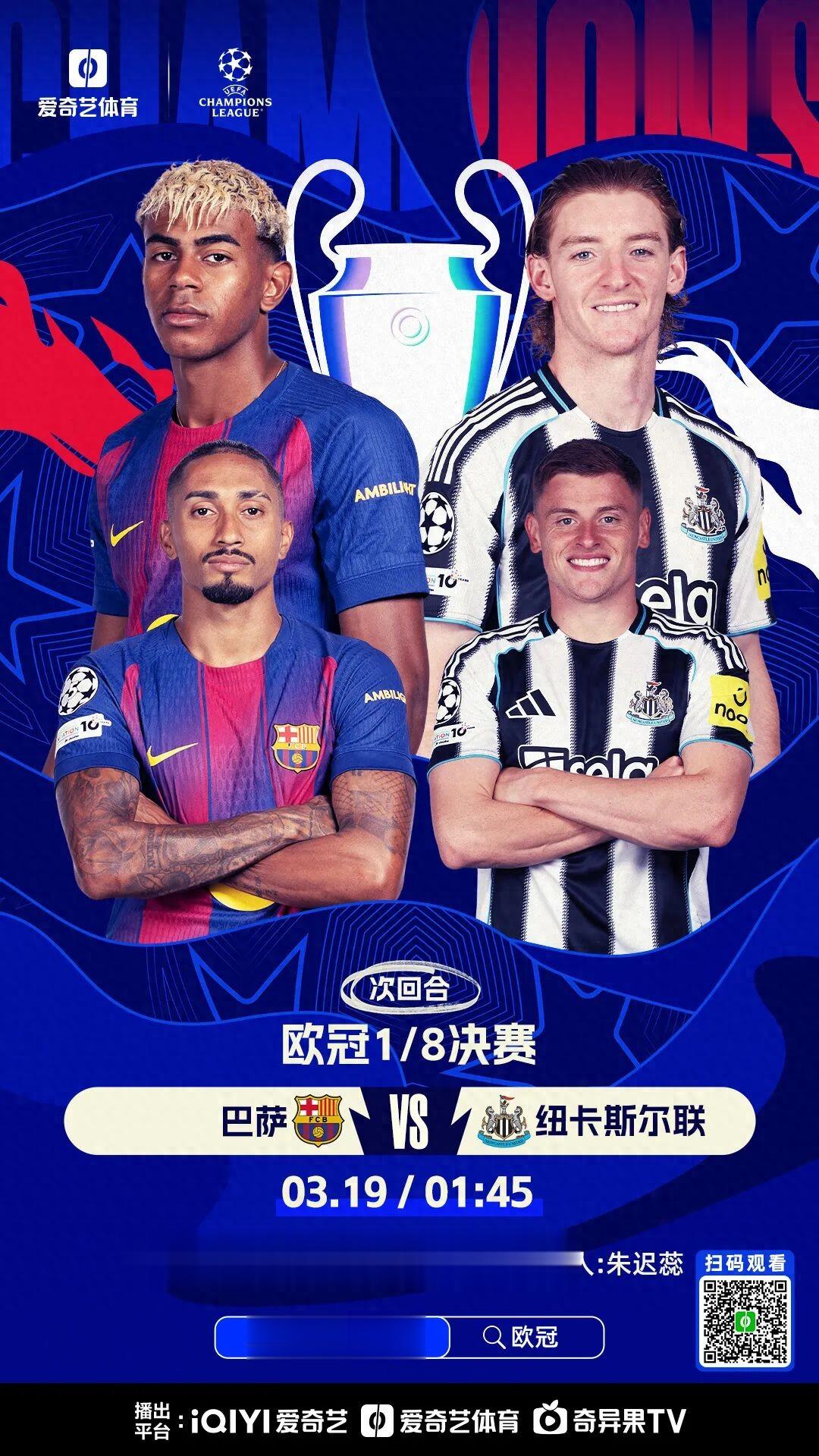 在2026年3月19日凌晨1点45将继续进行欧冠1/8次回合决赛第2比赛日的4场焦点对决,进行比赛双方:率先展开一场较量,巴萨将在主场诺坎普球场迎战纽卡斯尔联队,首回合巴塞罗那在客场以1vs1踢平纽卡斯尔联队,此役来到巴塞罗那主场诺坎普球场迎战纽卡斯尔联队,本场比赛转播平台:爱奇艺体育将全媒体独家播出。