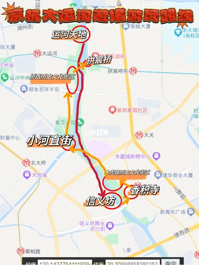 运河天地码头-坐3元运河水上巴士1号线-信义坊码头-香积寺-大兜路历史文化街区-小河直街-桥西历史文化街区-拱宸桥