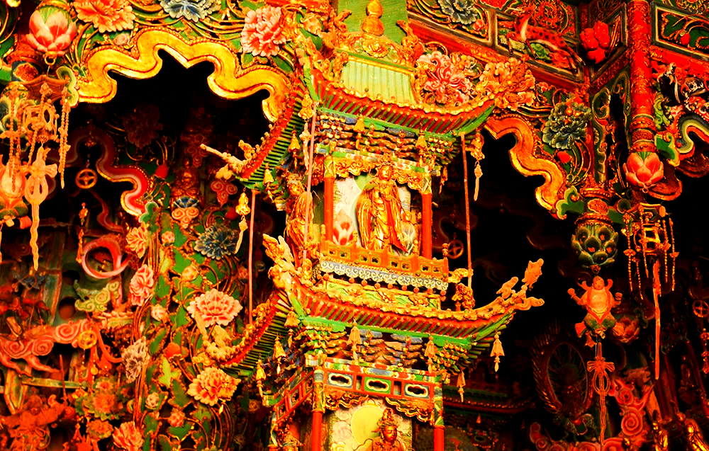 观音阁·立体悬塑:二楼的观音像立在莲花座上,背后是“九龙捧莲”悬塑,龙的鳞片用金箔贴成,在光线下泛着柔光。阁外的“悬塑长廊”有“二十四孝”故事雕塑,适合给孩子讲传统美德。