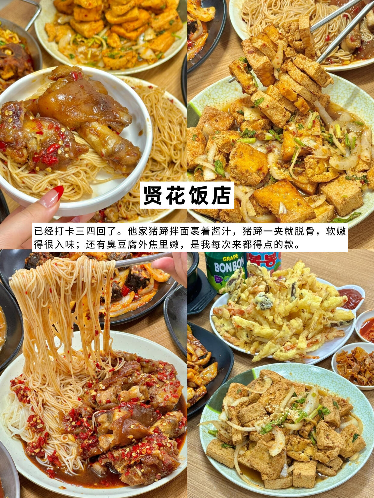 [星R]贤花饭店:已经打卡三四回了。他家猪蹄拌面裹着酱汁,猪蹄一夹就脱骨,软嫩得很入味;还有臭豆腐外焦里嫩,是我每次来都得点的款。