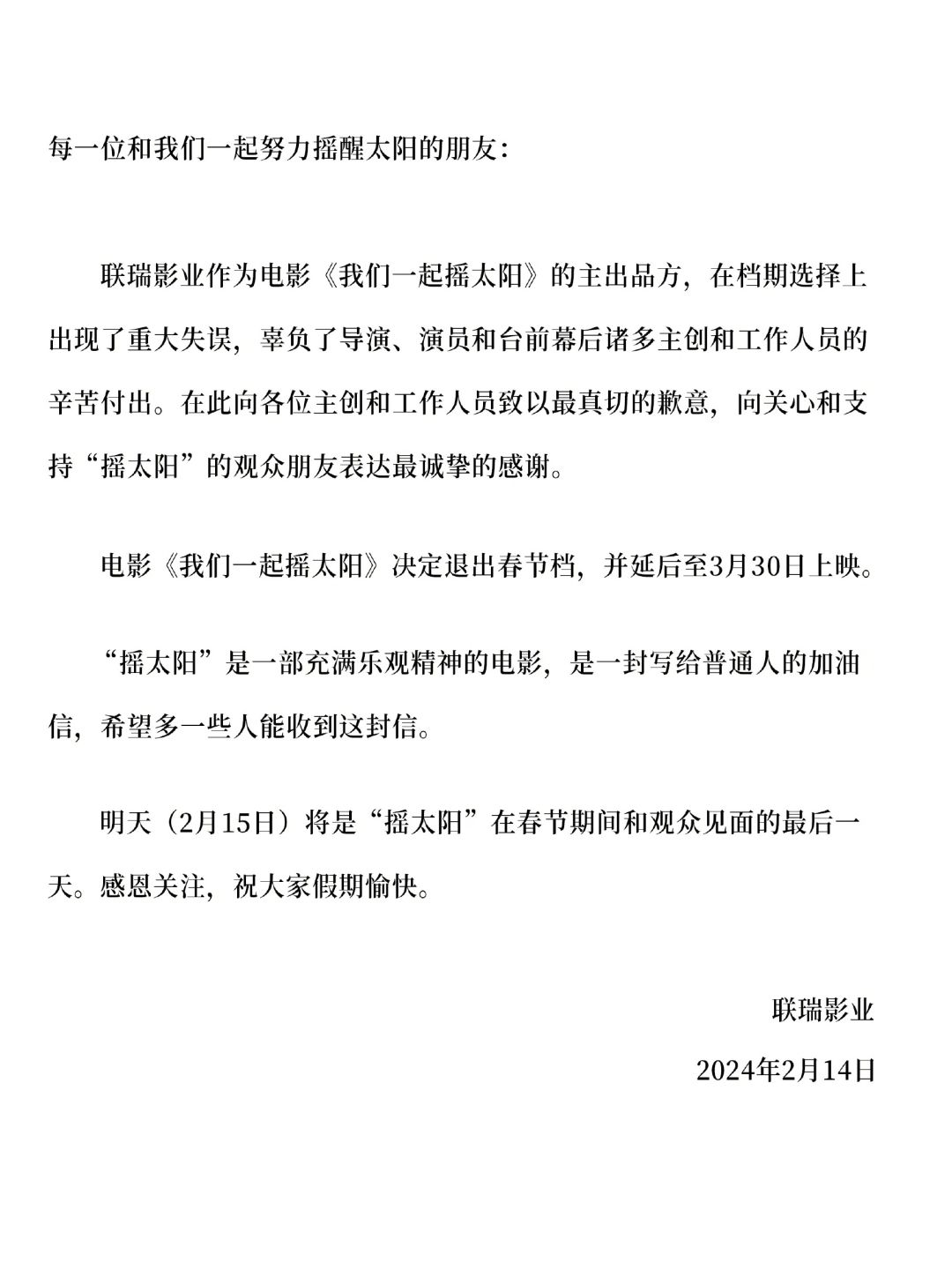 春节档的竞争历来都是很惨烈的,是英雄,也要顺应环境,为《我们一起摇太阳》鸣不平‼‼‼ 这部电影让我长了恋爱脑,又重新相信爱情了,有笑有泪,不是一部丧片,是温暖的,感动的,就像情人节那天发放的糖果,片内片外都一样暖心。 苦于排片量太少,又苦于上映日期,春节档大家都想要开怀大笑,生命这个话题的电影,要是放在清明档期,必定能更上一层楼。 太阳每天东升西落,也会累,也会打瞌睡,所以当我们遇到阴天雨天,这个时候我们就要用意念把太阳摇醒。 改档是明智的,在春节档没升起的太阳,我们一起去下一个档期摇醒它。