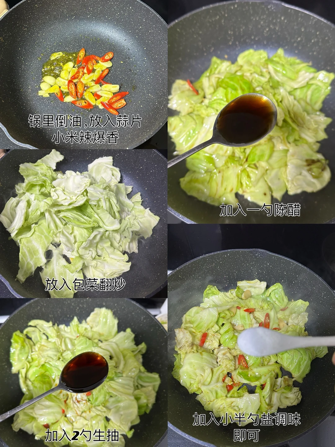 1️⃣锅里倒油,放入蒜片,小米辣爆香,倒入包菜翻炒,加入2勺生抽,1勺陈醋,小半勺盐调味,翻炒均匀,即可