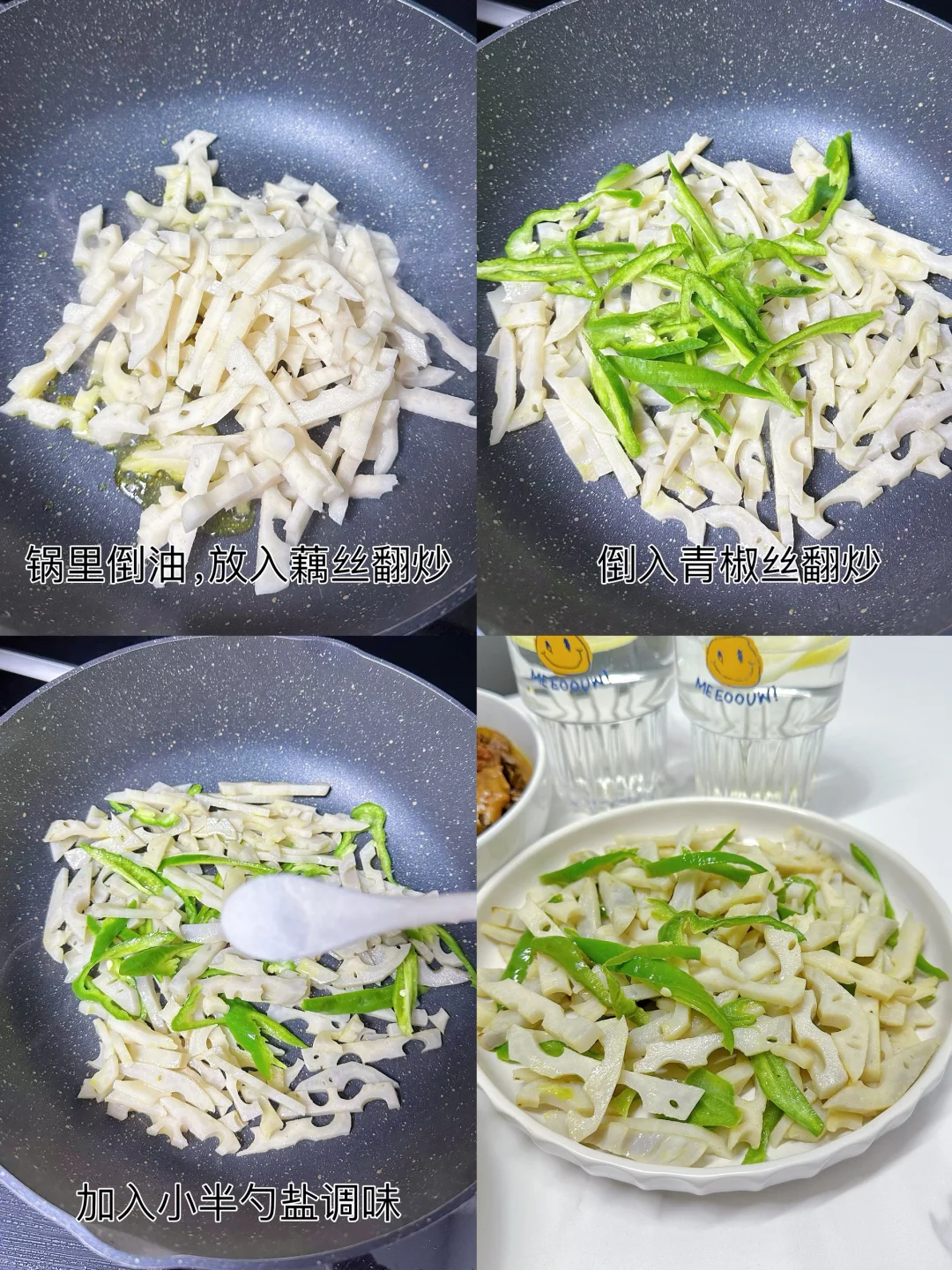 1️⃣锅里倒油,放入藕丝翻炒,倒入青椒丝继续翻炒,加入小半勺盐调味,翻炒均匀,即可