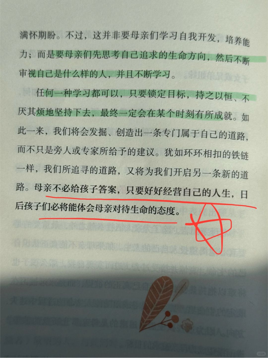 鸡娃不如鸡自己! 母亲必须全心投入自己的生命中,对自己的生命满怀期盼。不过,这并非要母亲们学习自我开发,培养能力;而是要母亲们先思考自己追求的生命方向,然后不断审视自己是什么样的人,并且不断学习。 任何一种学习都可以,只要锁定目标,持之以恒、不厌其烦地坚持下去,最终一定会在某个时刻有所成就。