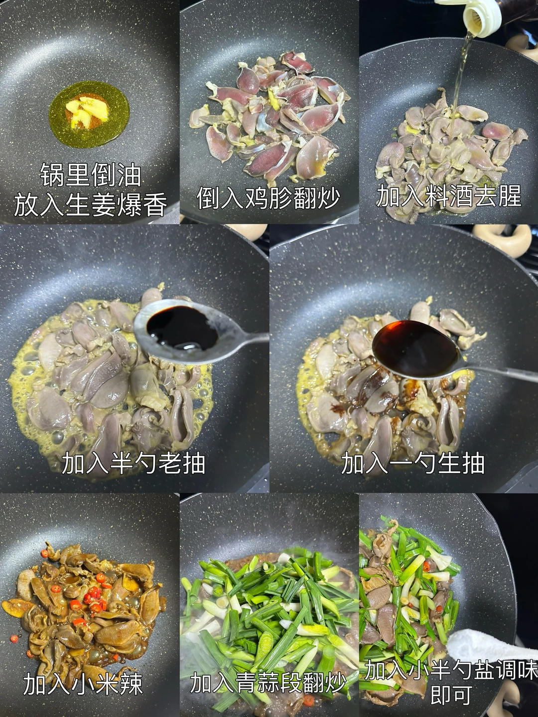 1️⃣锅里倒油,放入生姜爆香,倒入鸡胗翻炒,加入适量料酒去腥,倒入半勺老抽,一勺生抽
