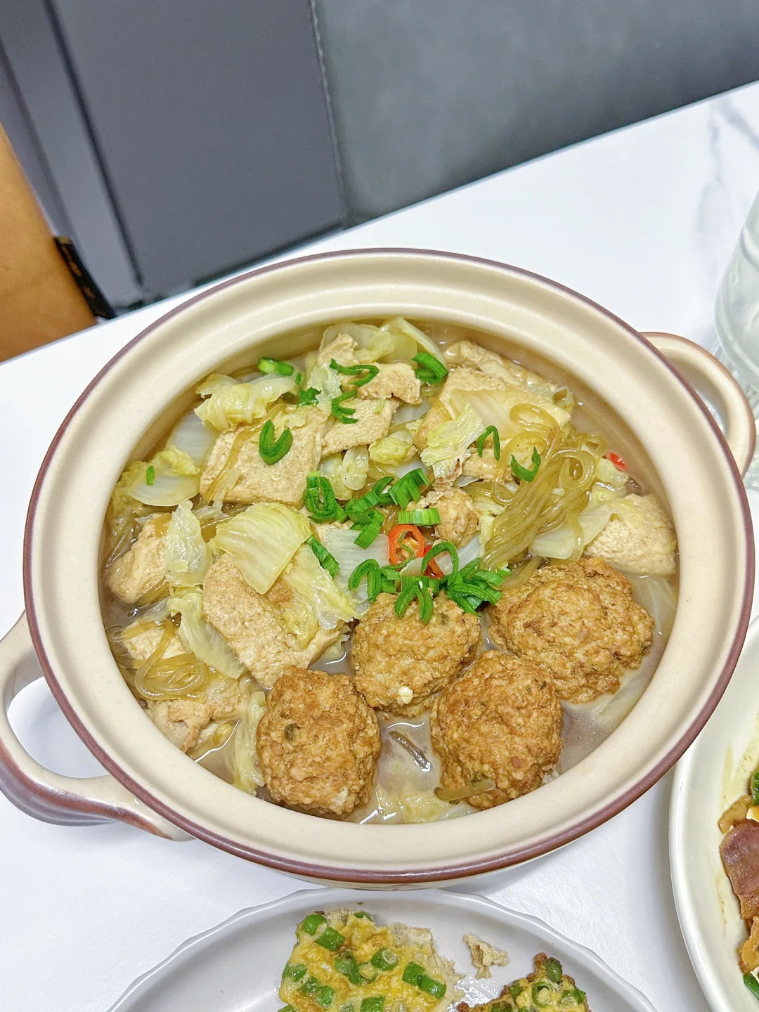 食材:白菜 豆腐 肉丸 粉条 小米辣 青蒜