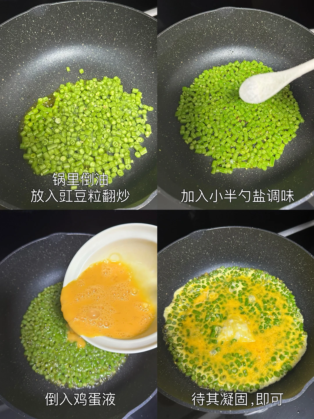 1️⃣锅里倒油,放入豇豆粒翻炒,加入小半勺盐调味,倒入鸡蛋液,待其凝固,即可
