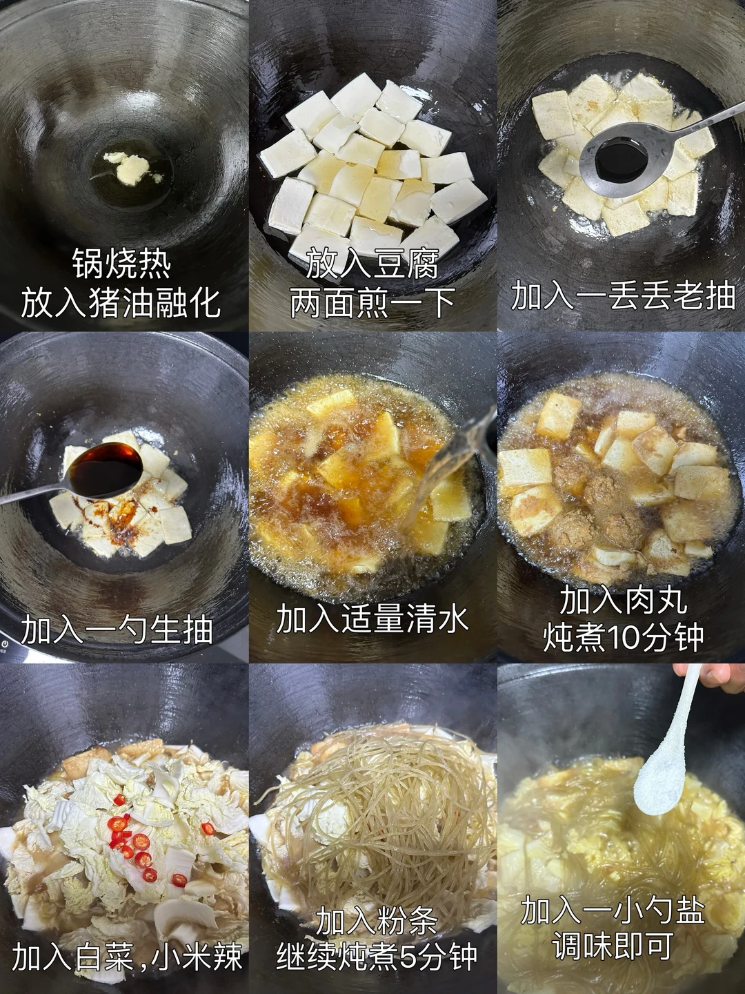 1️⃣锅烧热,放入猪油融化,放入豆腐两面煎一下,加入一丢丢老抽,一勺生抽,加入适量清水,加入肉丸,炖煮10分钟