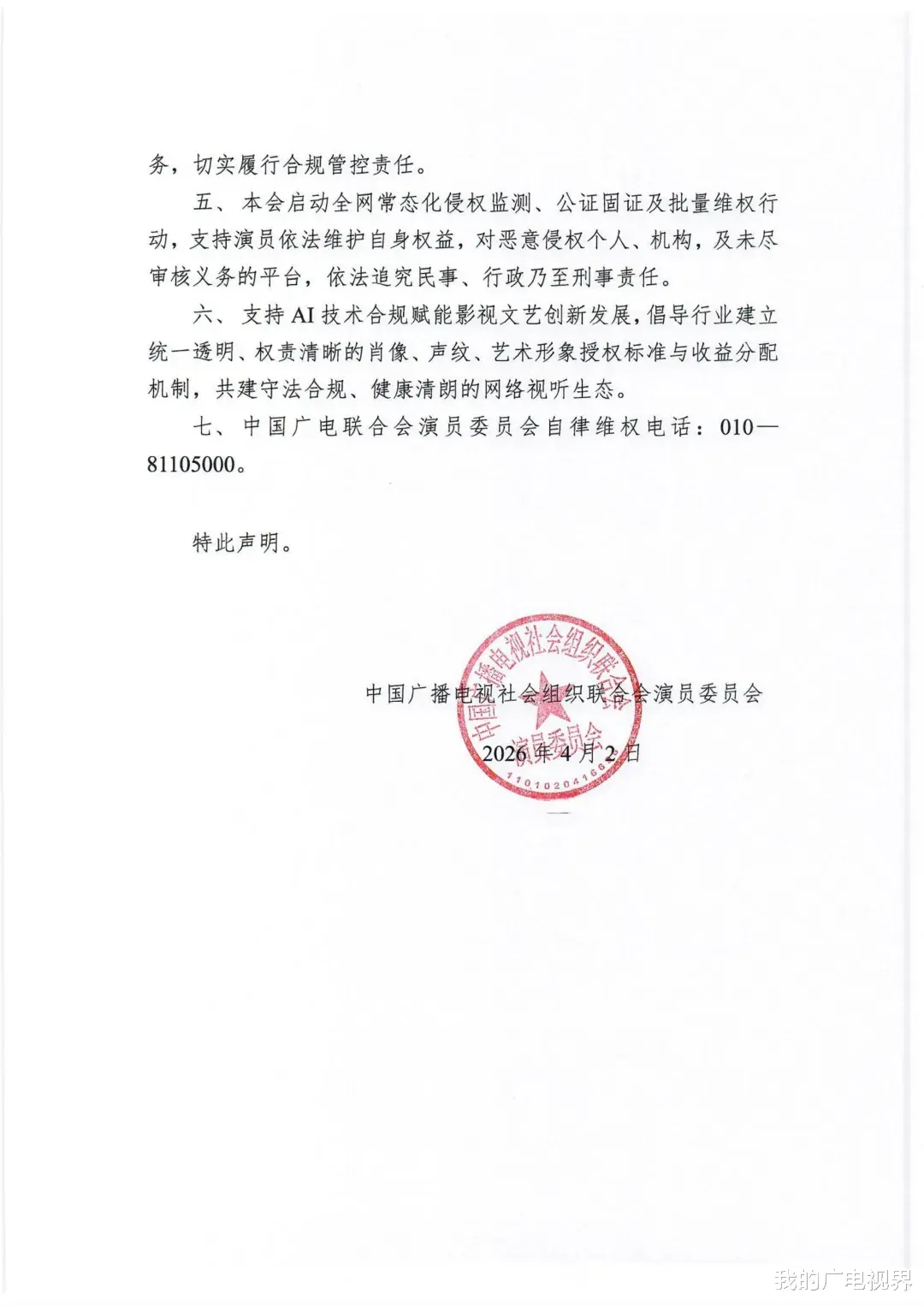 声明强调,支持AI技术合规赋能影视文艺创新发展,倡导行业建立统一透明、权责清晰的肖像、声纹、艺术形象授权标准与收益分配机制,共建守法合规、健康清朗的网络视听生态。