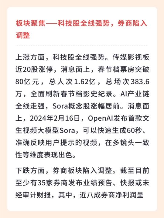 👉 上涨方面,科技股全线强势。传媒影视板近20股涨停,消息面上,春节档票房突破80亿元,总人次1.62亿,总场次383.6万,全面刷新春节档影史纪录。AI产业链全线走强,Sora概念股涨幅居前。消息面上,2024年2月16日,OpenAI发布首款文生视频大模型Sora,可以快速生成60秒、准确反映用户提示的视频,在多镜头一致性等维度表现出色。