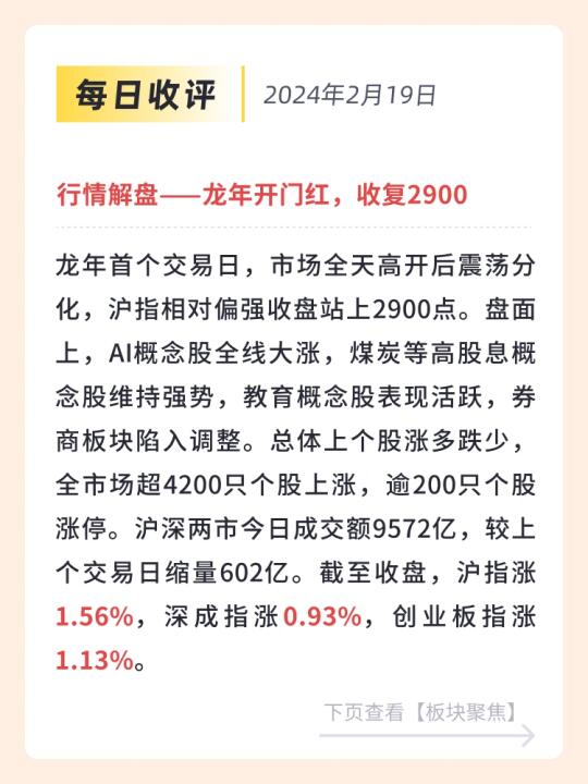 👉 龙年首个交易日,市场全天高开后震荡分化,沪指相对偏强收盘站上2900点。盘面上,AI概念股全线大涨,煤炭等高股息概念股维持强势,教育概念股表现活跃,券商板块陷入调整。总体上个股涨多跌少,全市场超4200只个股上涨,逾200只个股涨停。沪深两市今日成交额9572亿,较上个交易日缩量602亿。截至收盘,沪指涨1.56%,深成指涨0.93%,创业板指涨1.13%。