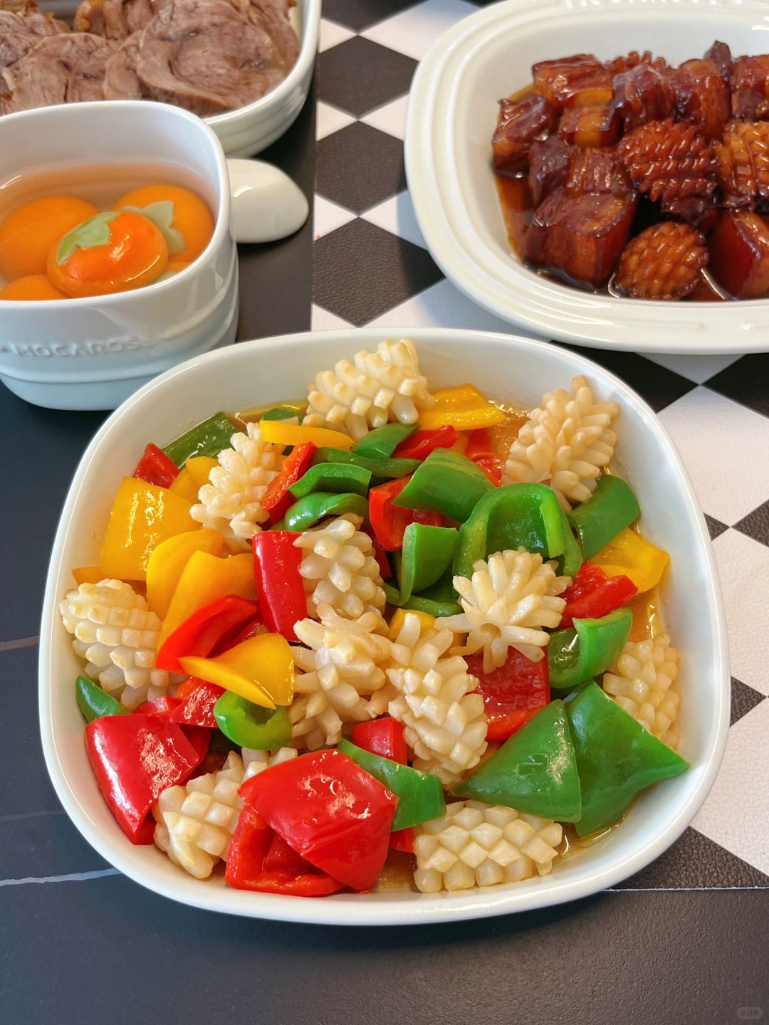 4️⃣餐具位置摆放:硬菜放餐桌中间C位,比如红烧类、海鲜类等其它精美的肉菜,这样更能突显主菜地位。