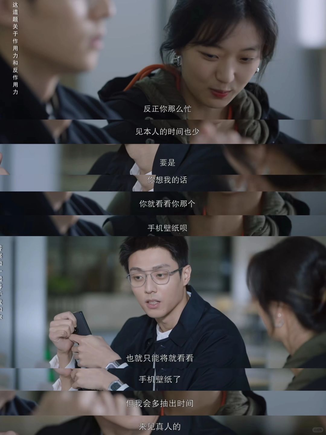 陶姝娜在实验室问张小彦数据时,偶然发现了他手机里自己的照片,不言而喻直接转正并拍了甜蜜合照,张小彦嘴上说着没本人好看,手倒是很实诚,直接把合照设置为手机壁纸!