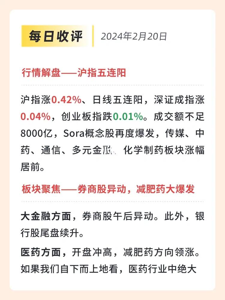 👉 沪指涨0.42%、日线五连阳,深证成指涨0.04%,创业板指跌0.01%。成交额不足8000亿,Sora概念股再度爆发,传媒、中药、通信、多元金融、化学制药板块涨幅居前。