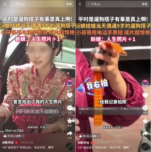 有网友晒出,自己的“遛狗搭子”,9岁的小孩哥,用小天才电话手表给拍出了一套婚礼神图。