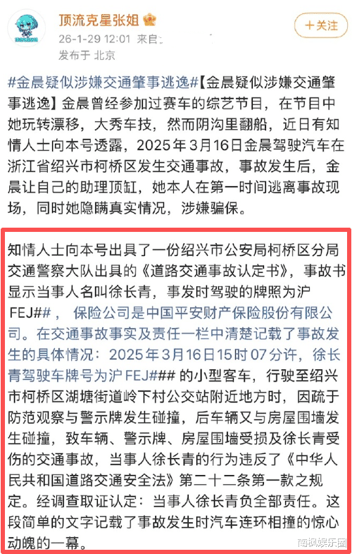 文案表示上一年,金晨开车在浙江发生了交通事故,事故发生后,金晨第一时间逃离现场,让助理顶锅。