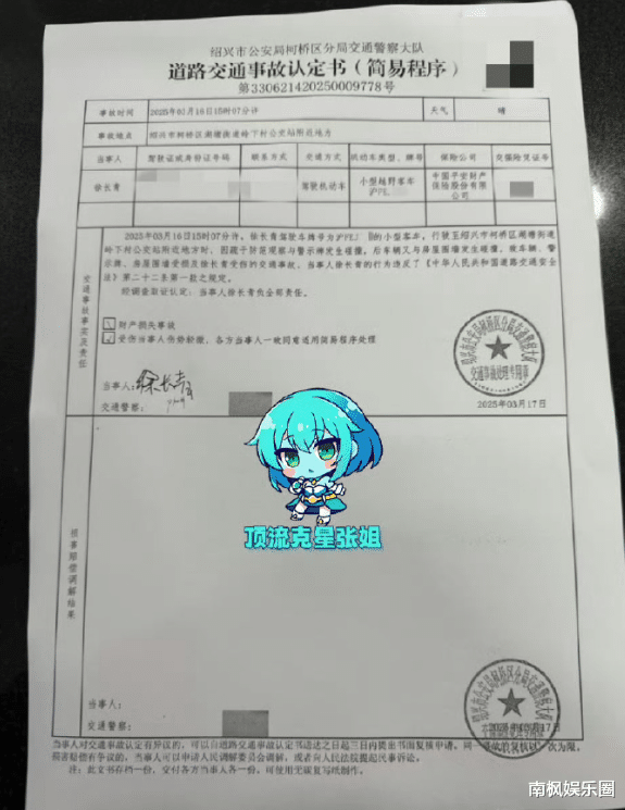 同时,狗仔还附上了一张带有金晨助理签字的“道路交通事故认定书”。