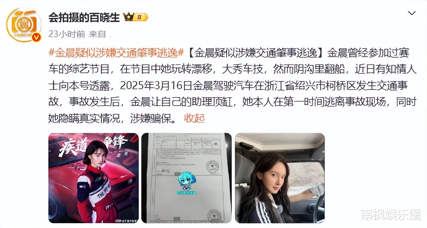 毫无征兆之下,狗仔突然爆料金晨“疑似涉嫌交通肇事逃逸”。