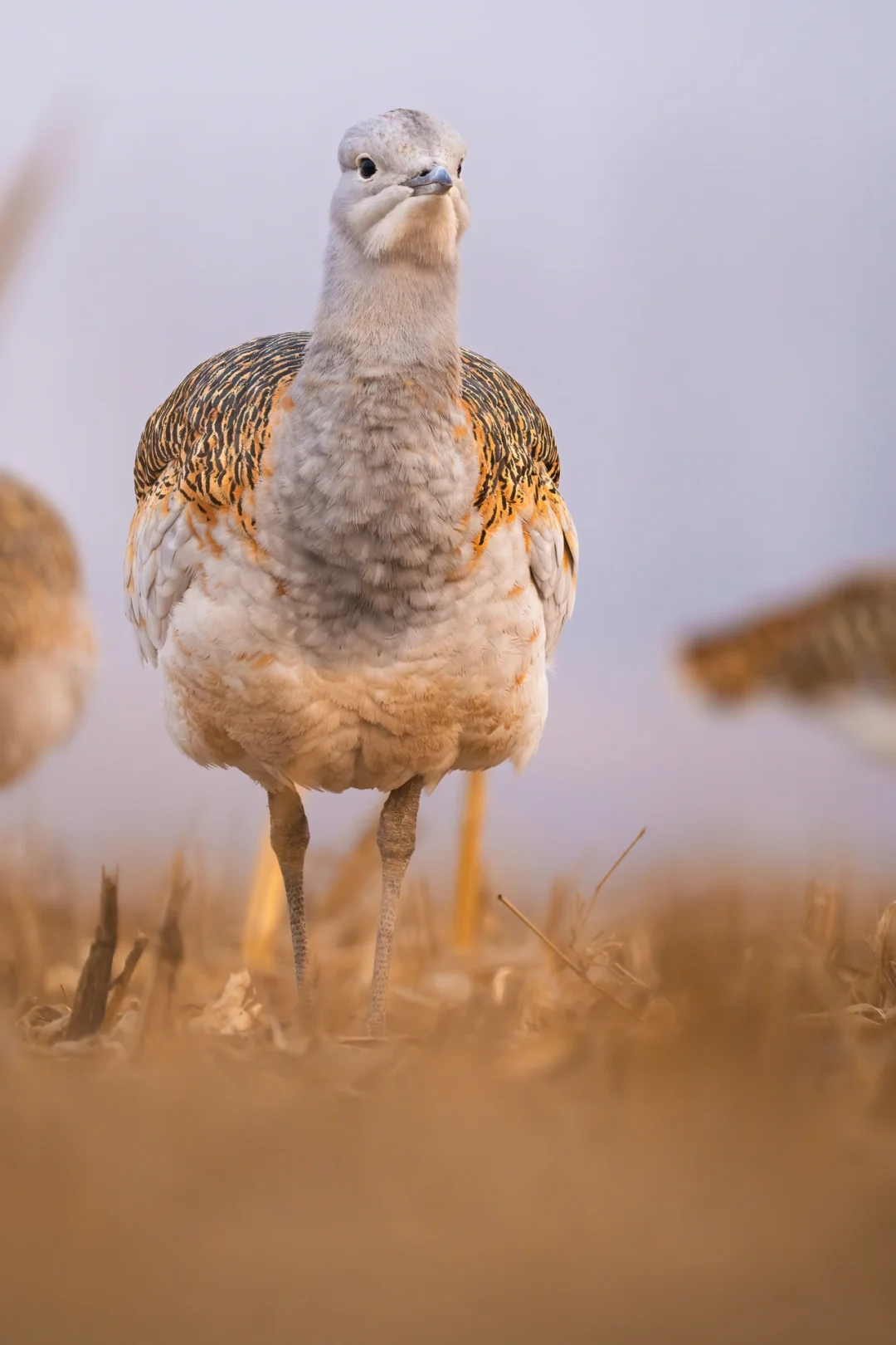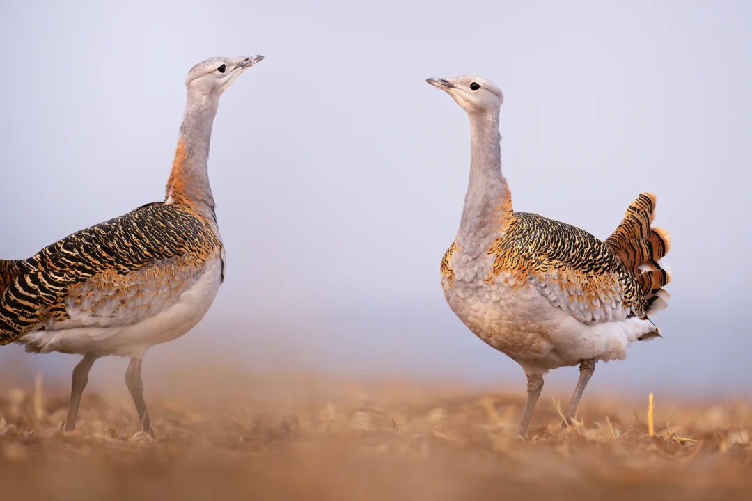 风车、玉米地和拖拉机,就是华北平原冬日的象征。分布在北方草原上的大鸨,有相当多数量会选择南迁至华北平原未收割的玉米地和麦田,依靠收割过后的残余过冬,由此与华北平原的你我有了交集。在京外的小小几公顷玉米地里,栖息着中国近十分之一的大鸨东部越冬种群。大鸨是中国最重的飞鸟,而雄性大鸨的体重是雌鸟的2-3倍。冬季行将结束,雄鸟已经感受到了春天的气息,开始变得异常活跃。接近一百只大鸨分散成小群,将我们团团围住,虽然天气不佳,但能看到近距离觅食、求偶,也心满意足了[派对R]