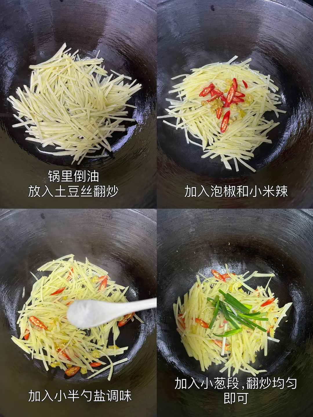 1️⃣锅里倒油,放入土豆丝翻炒,倒入小米辣和泡椒,翻炒均匀,加入小半勺盐调味,加入小葱段,翻炒均匀,即可