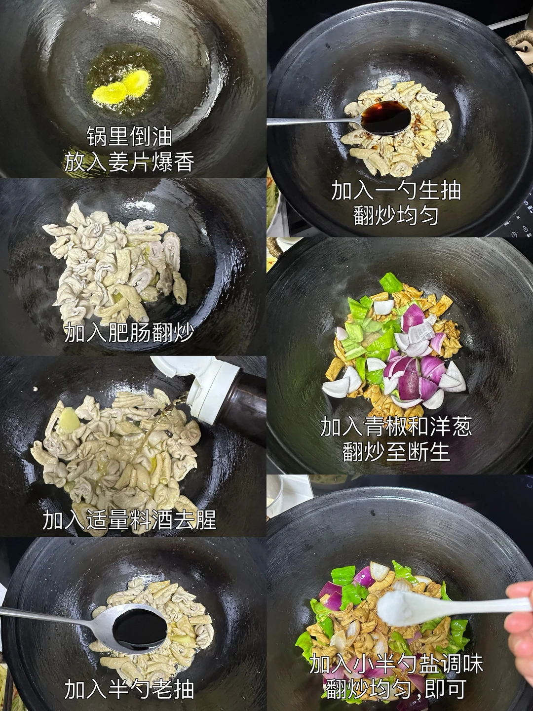 食材:肥肠 洋葱 青椒 生姜