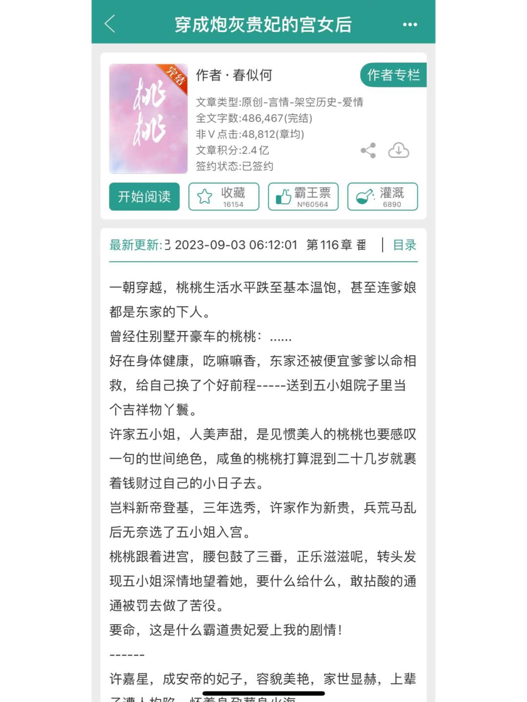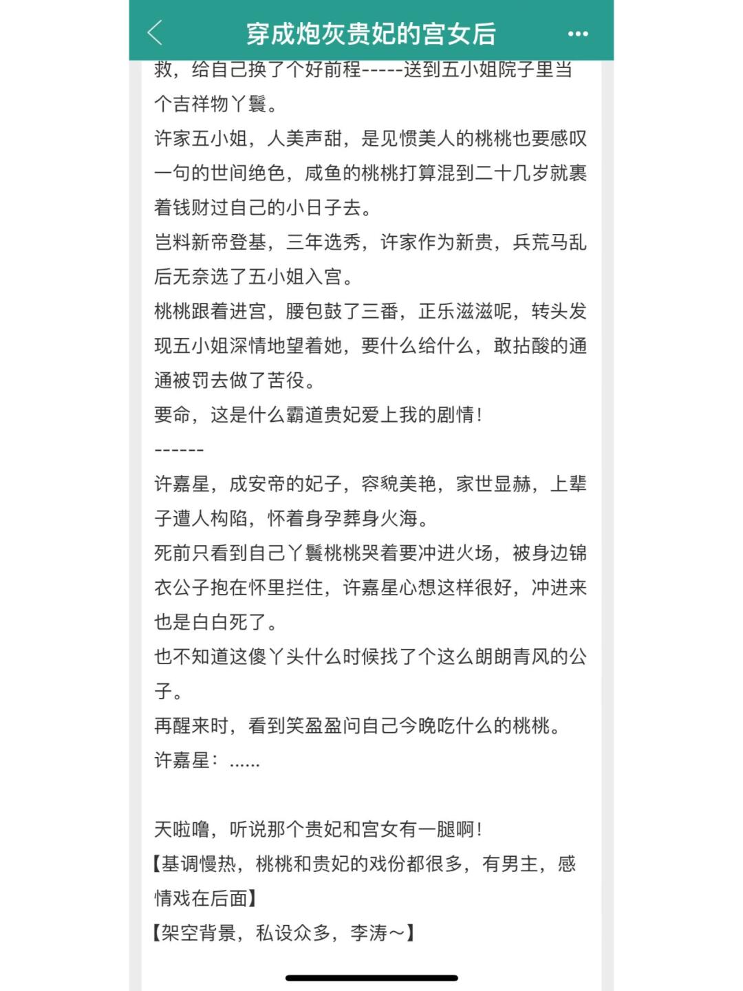 本期推荐:《穿成炮灰贵妃的宫女后》,作者:春似何