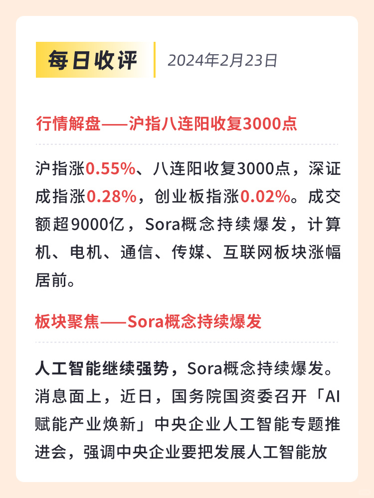 👉 沪指涨0.55%、八连阳收复3000点,深证成指涨0.28%,创业板指涨0.02%。成交额超9000亿,Sora概念持续爆发,计算机、电机、通信、传媒、互联网板块涨幅居前。