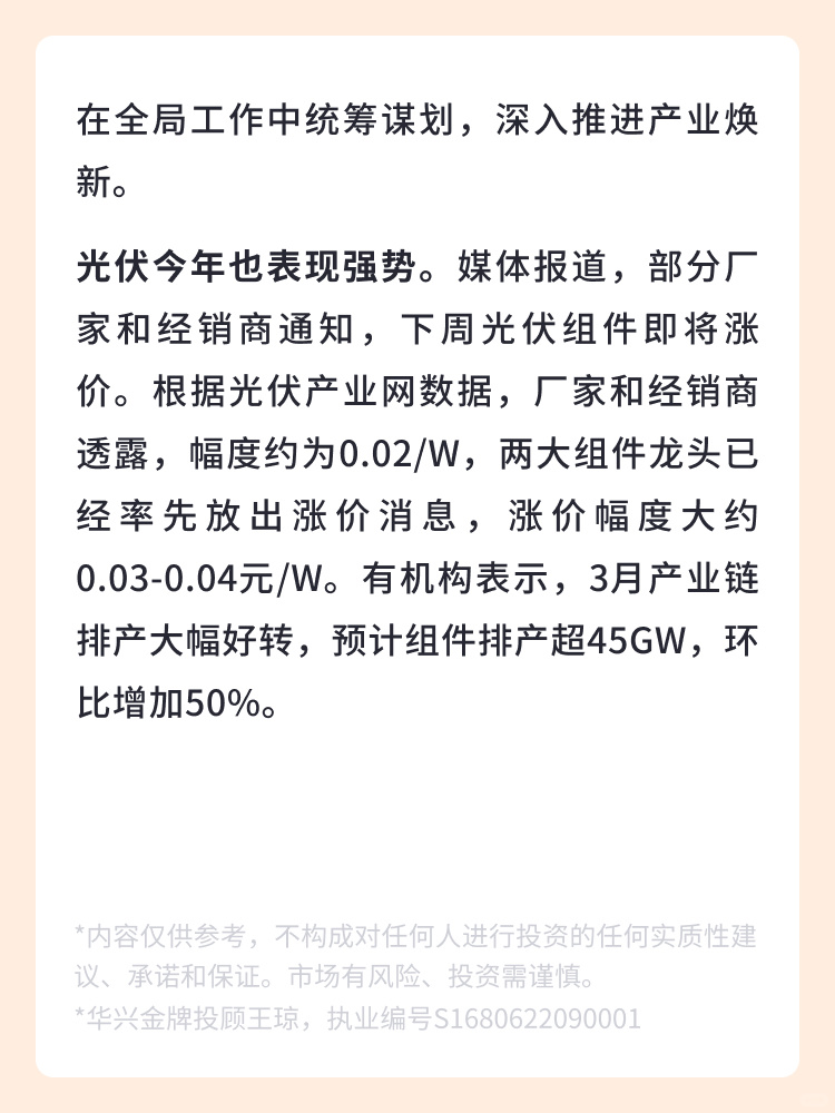 👉 光伏今年也表现强势。媒体报道,部分厂家和经销商通知,下周光伏组件即将涨价。根据光伏产业网数据,厂家和经销商透露,幅度约为0.02/W,两大组件龙头已经率先放出涨价消息,涨价幅度大约0.03-0.04元/W。有机构表示,3月产业链排产大幅好转,预计组件排产超45GW,环比增加50%。