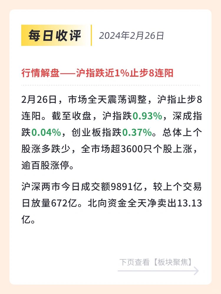 👉 2月26日,市场全天震荡调整,沪指止步8连阳。截至收盘,沪指跌0.93%,深成指跌0.04%,创业板指跌0.37%。总体上个股涨多跌少,全市场超3600只个股上涨,逾百股涨停。