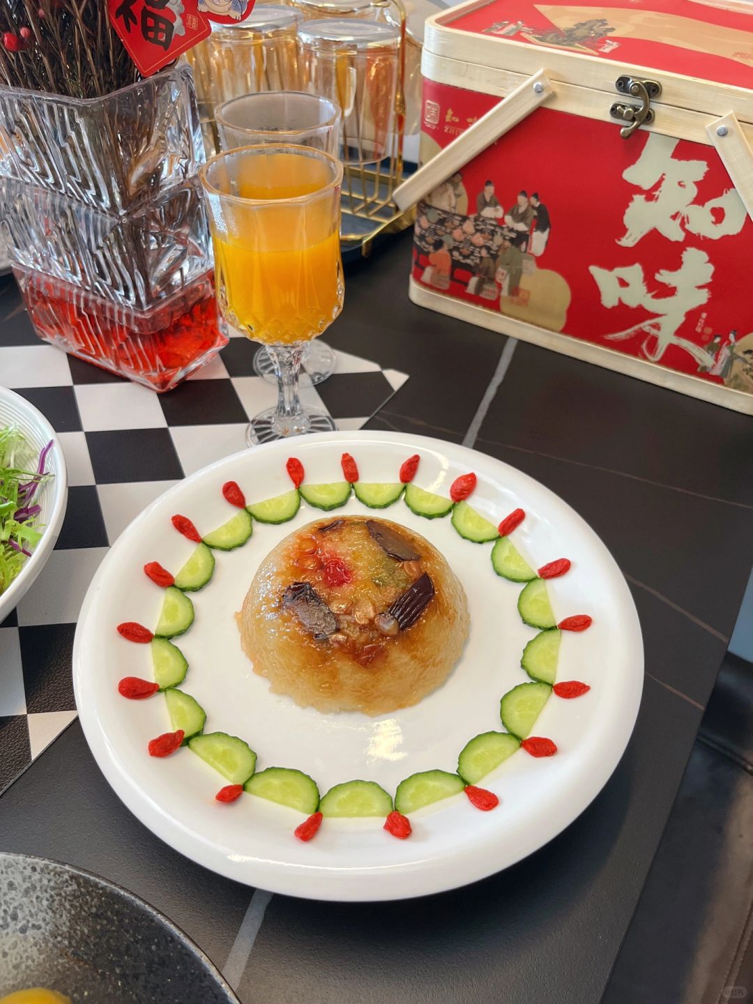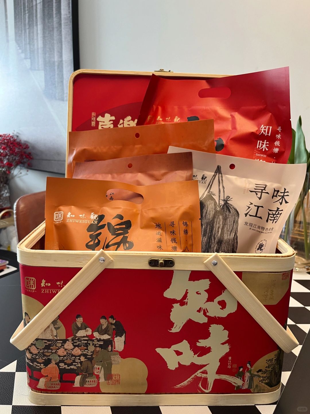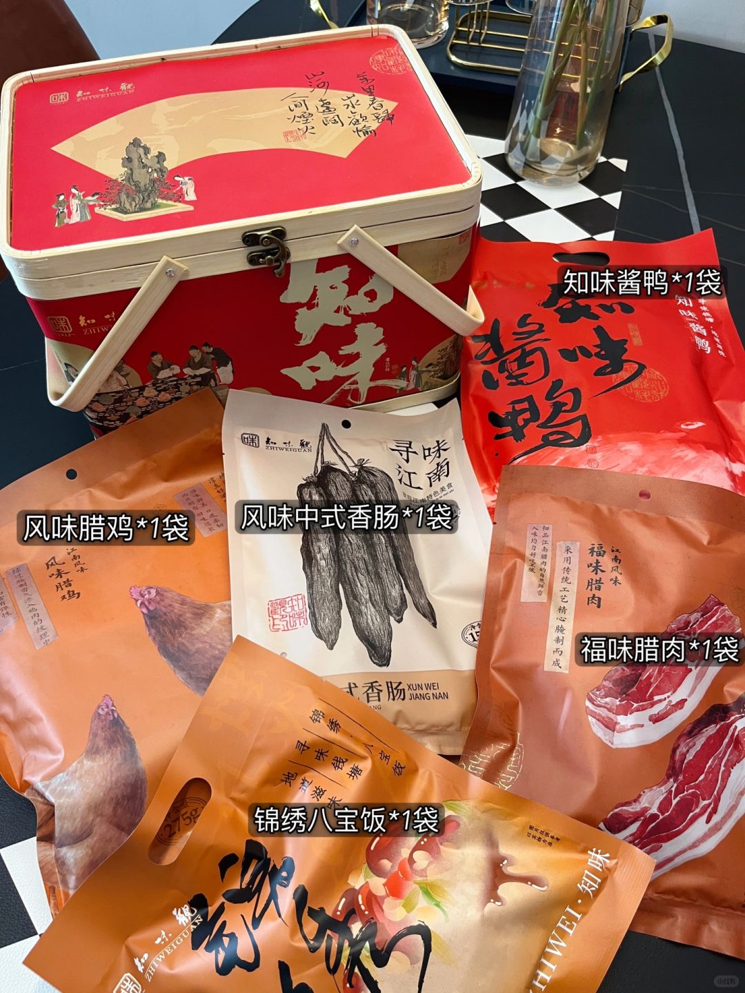 吃完饭特意给朋友们准备了年货礼盒当做新年礼物,前几年去杭州旅游的时候买过,近两年过节也会多准备几盒送亲戚朋友,它家的种类很多,我今年入的是【知味山海】礼盒,里面包含:风味腊鸡1袋、风味中式香肠1袋、福味腊肉1袋、知味酱鸭1袋、锦绣八宝饭1袋,竹篮包装,书法字体国风满满 年味十足,送家人朋友在合适不过啦~朋友们都说好喜欢。