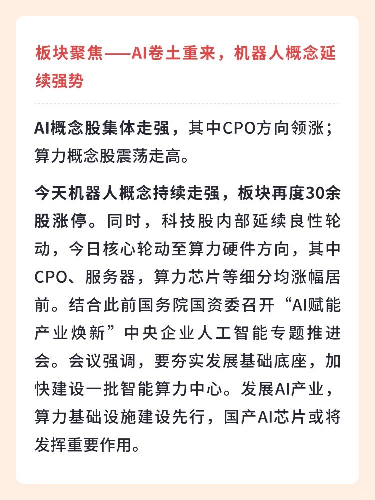 👉 今天机器人概念持续走强,板块再度30余股涨停。同时,科技股内部延续良性轮动,今日核心轮动至算力硬件方向,其中CPO、服务器,算力芯片等细分均涨幅居前。结合此前国务院国资委召开“AI赋能产业焕新”中央企业人工智能专题推进会。会议强调,要夯实发展基础底座,加快建设一批智能算力中心。发展AI产业,算力基础设施建设先行,国产AI芯片或将发挥重要作用。