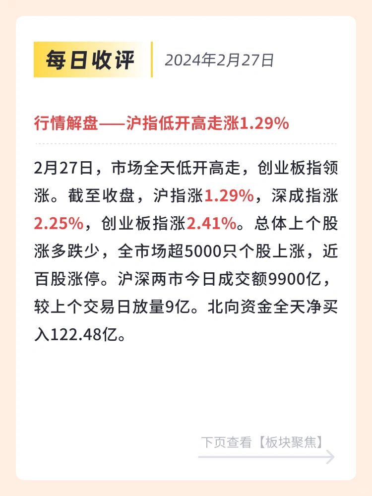 👉 2月27日,市场全天低开高走,创业板指领涨。截至收盘,沪指涨1.29%,深成指涨2.25%,创业板指涨2.41%。总体上个股涨多跌少,全市场超5000只个股上涨,近百股涨停。沪深两市今日成交额9900亿,较上个交易日放量9亿。北向资金全天净买入122.48亿。