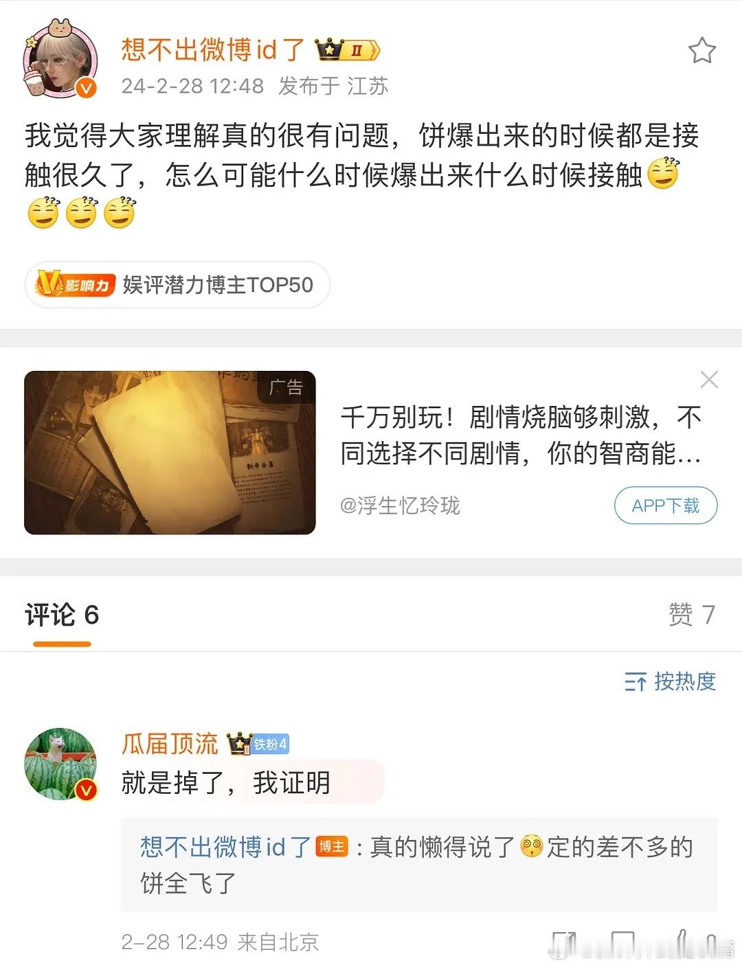 待爆谈恋爱真的会掉饼,三个瓜主说小胡这段时间连掉了饼。[揣手]所以说演员谈恋爱不