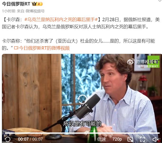 【卡尔森:乌克兰是纳瓦利内之死的幕后黑手】2月28日,据俄新社报道,美国记者卡尔森认为,乌克兰是俄罗斯反对派人士纳瓦利内之死的幕后黑手。卡尔森称:“他们还杀害了(亚历山大)杜金的女儿......是的,所以这是有可能的。”