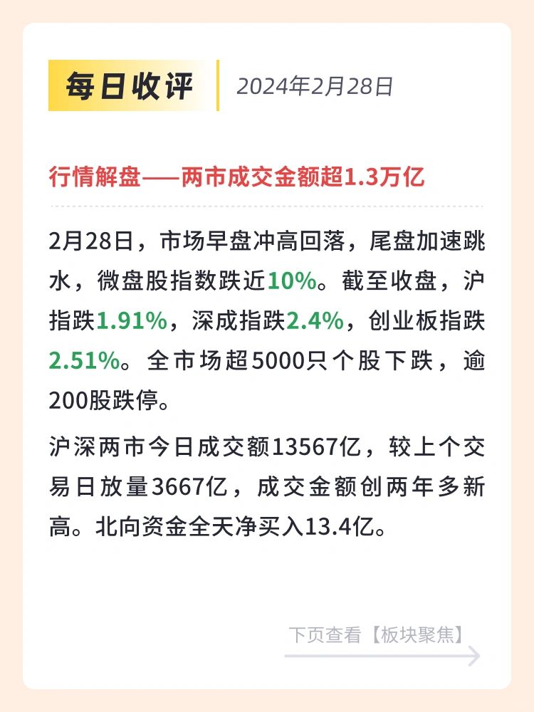 👉 2月28日,市场早盘冲高回落,尾盘加速跳水,微盘股指数跌近10%。截至收盘,沪指跌1.91%,深成指跌2.4%,创业板指跌2.51%。全市场超5000只个股下跌,逾200股跌停