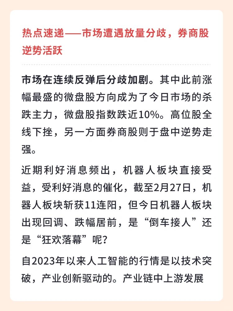 👉 近期利好消息频出,机器人板块直接受益,受利好消息的催化,截至2月27日,机器人板块斩获11连阳,但今日机器人板块出现回调、跌幅居前,是“倒车接人”还是“狂欢落幕”呢?