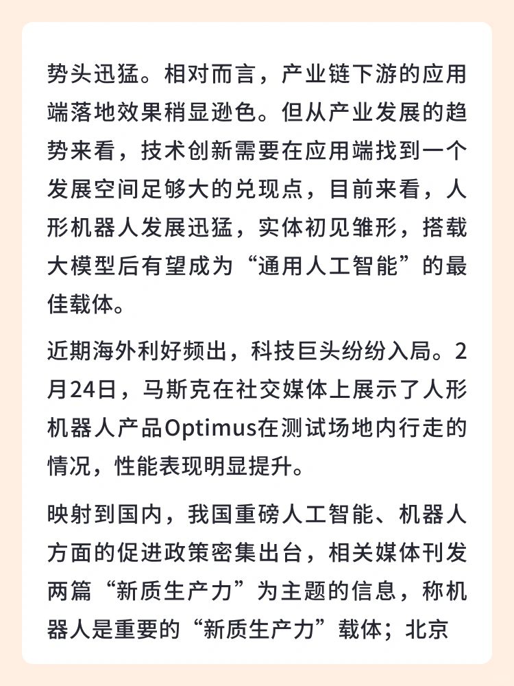👉 自2023年以来人工智能的行情是以技术突破,产业创新驱动的。产业链中上游发展势头迅猛。相对而言,产业链下游的应用端落地效果稍显逊色。但从产业发展的趋势来看,技术创新需要在应用端找到一个发展空间足够大的兑现点,目前来看,人形机器人发展迅猛,实体初见雏形,搭载大模型后有望成为“通用人工智能”的最佳载体。