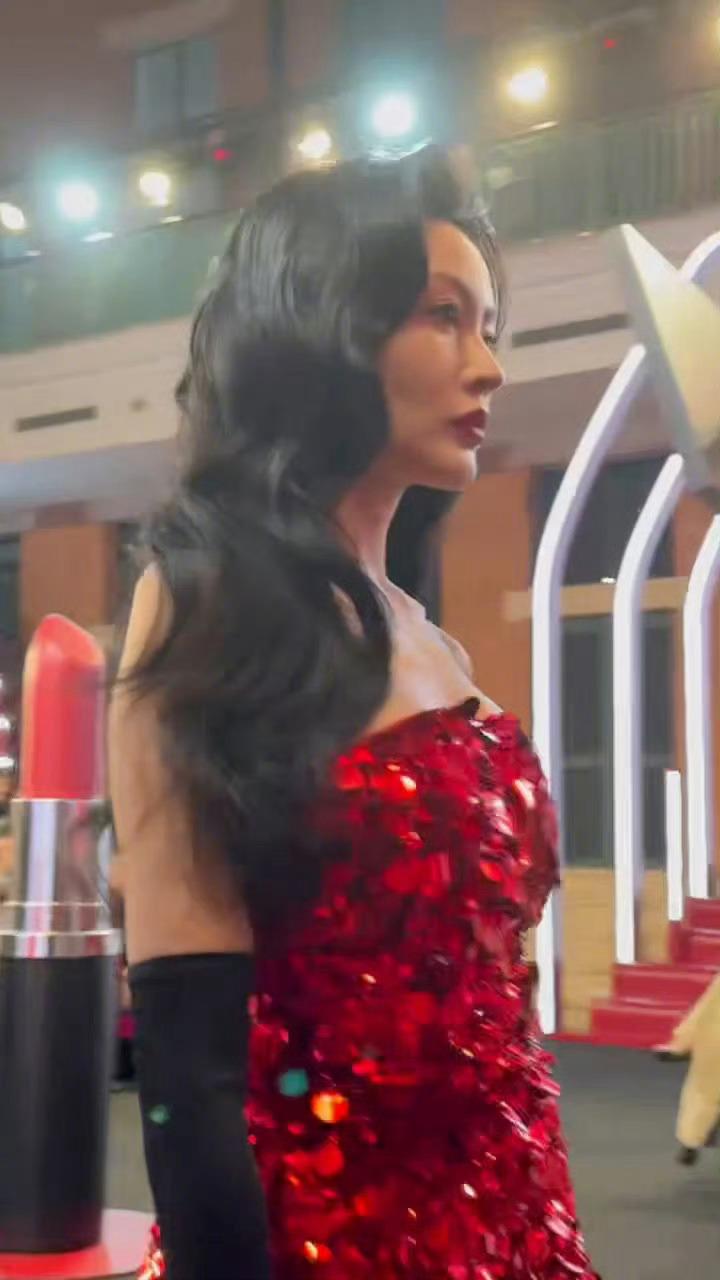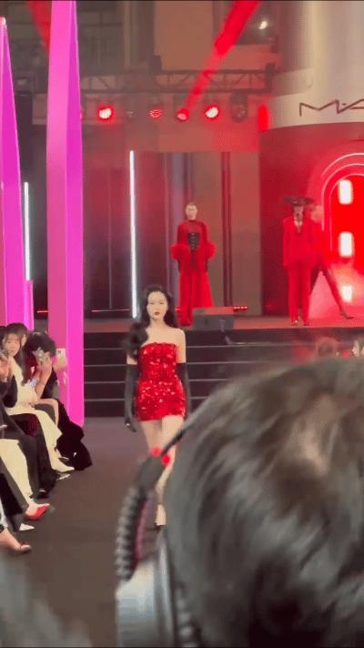 #张天爱走秀# 张天爱红色亮片露肩短裙为品牌走秀,冷脸好飒[憧憬]