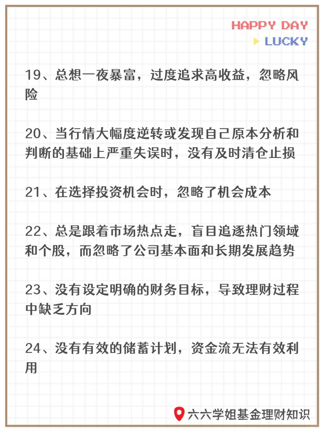 你好呀,我是带你学理财赚💰钱的六六学姐 . 常常听人说,“你不理财,财不离开你”😭 . 其实也不无道理 . 一些错误的理财习惯,真的只会让钱离你越来越远💥 . 今天给大家总结了2⃣4⃣个容易翻车的理财骚操作❌,希望有这些习惯的同学,赶紧改正过来 . 🌸我是六六,一枚热爱搞钱的深圳职场人 ✨持续分享理财干货|基金知识|搞钱方法|女性成长 🔥关.注六六学姐,一起养肥小金库,成为更好的自己 .