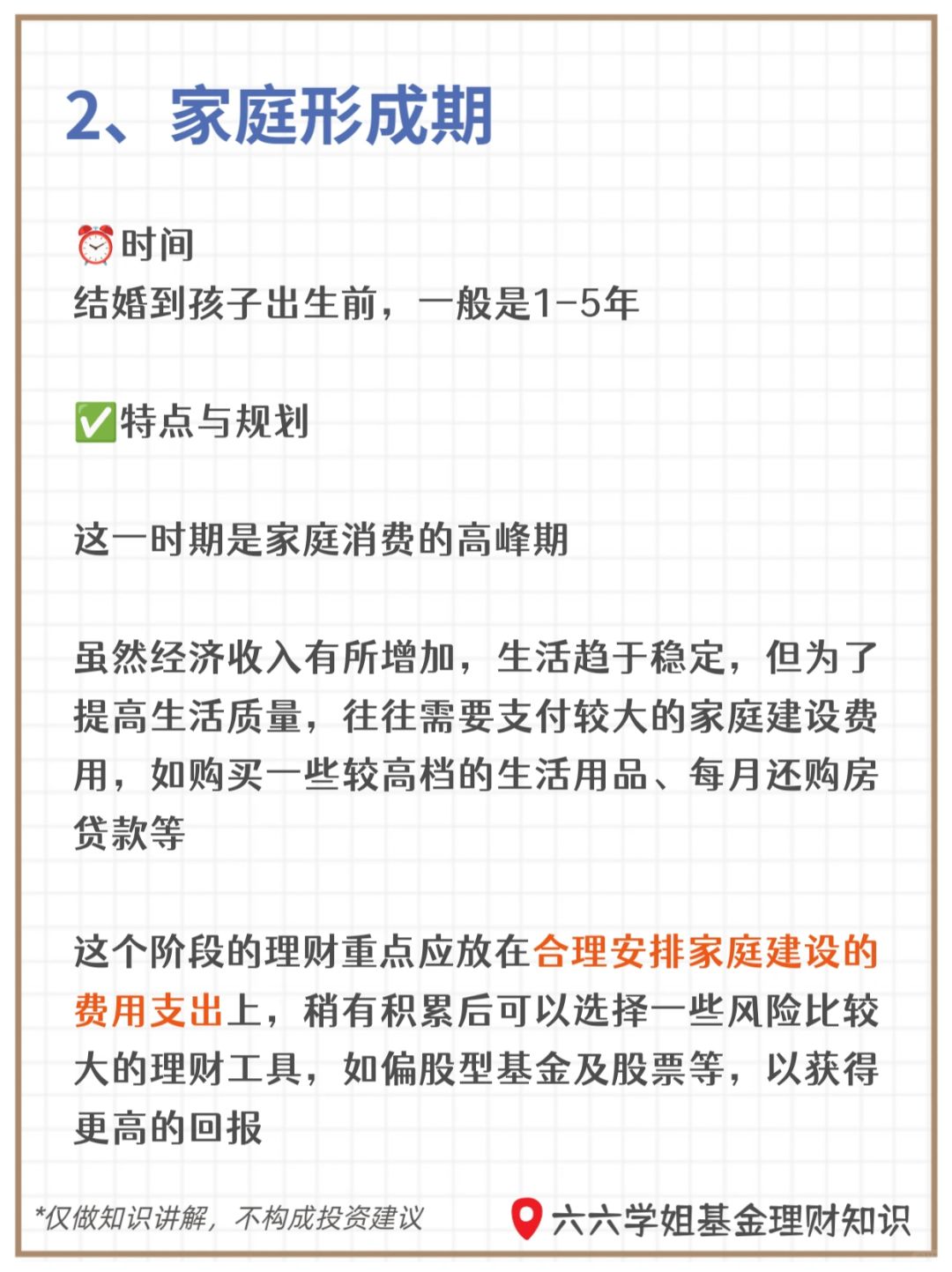 你好呀,我是带你学理财养基金赚💰钱的六六学姐 . 我们都知道,人生不同时期,对于金钱的需求不同,风险偏好也不同,理财自然也不能一成不变✨ . 因此,根据自己的实际情况,及时调整我们的理财计划,非常重要💥 . 今天就跟大家聊聊,不同时期的理财思路📈 . 内容仅供参考,具体的还得结合自己的实际情况灵活调整哦 . 🌸我是六六,一枚热爱搞钱的深圳职场人 ✨持续分享理财干货|基金知识|搞钱方法|女性成长 🔥关注六六学姐,一起养肥小金库,成为更好的自己~ .