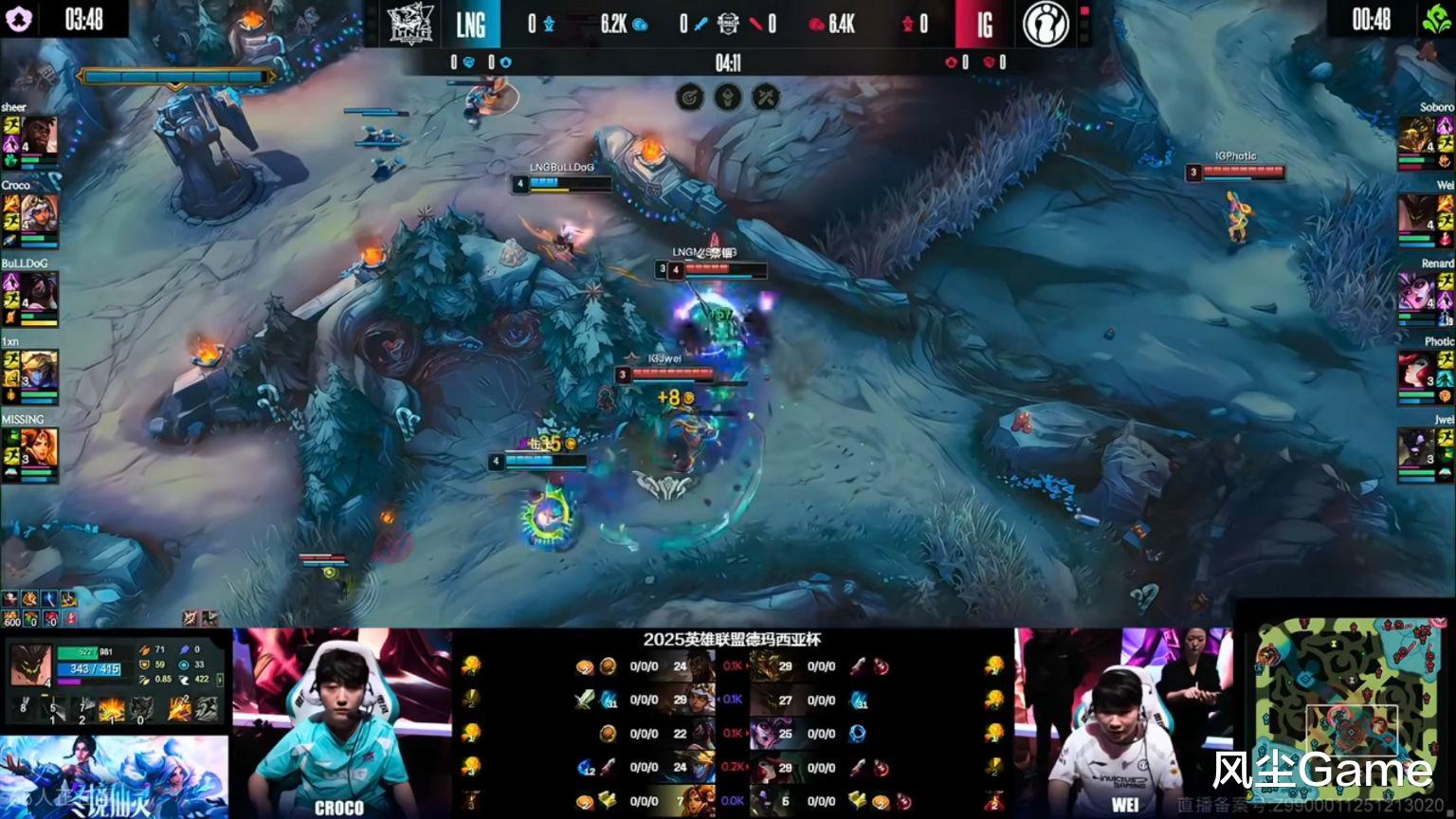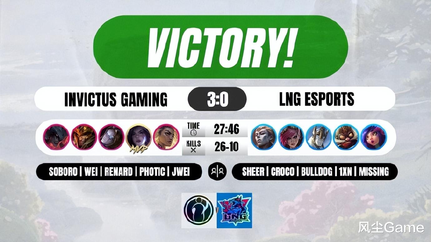 这场比赛IG展现出来的实力,确实是有点强的,第一把Wei前期节奏碾压,各种抓人、控资源,才17分钟LNG就被迫接停牌龙团,Jwei给机会被秒的情况下,IG四打五,愣是把团战打赢了,后续的龙魂团,上路打出一波单杀,LNG减员不敢接团,IG拿到龙魂,稳健运营轻松赢下第一局。