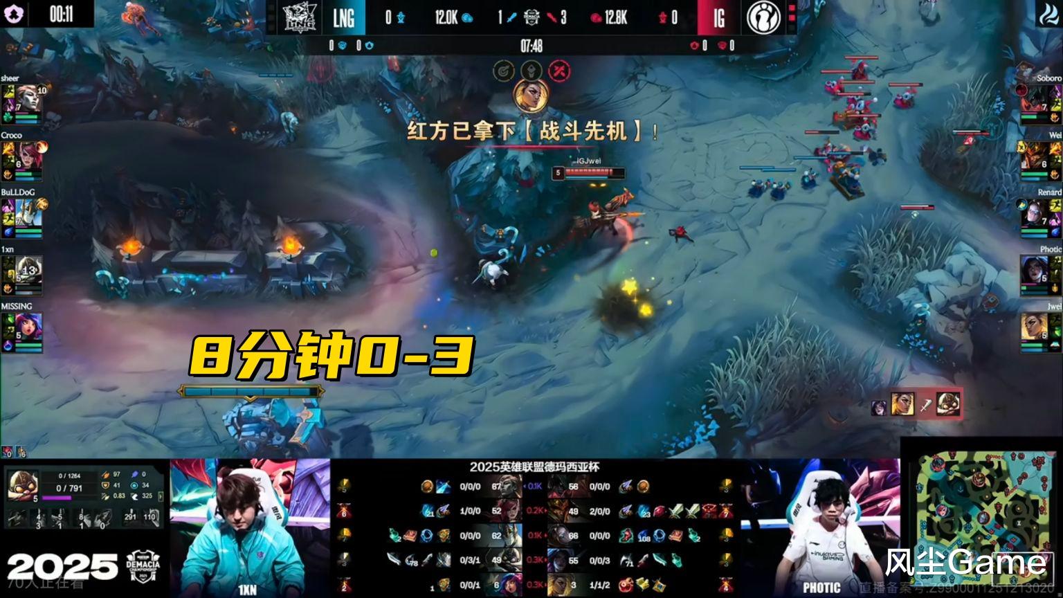 第三把Wei疯狂针对下路,3分钟抓一波,6分钟又抓一波,后续双人组打出线杀,才不到8分钟,1xn就0-3开局了,下路炸穿,上路也出问题,打野强行越塔,结果骚包肉一打二反杀打野,全线优势的IG,团战跟砍瓜切菜一样,打得LNG毫无还手之力,这场也是不到28分钟,IG直接拿下。