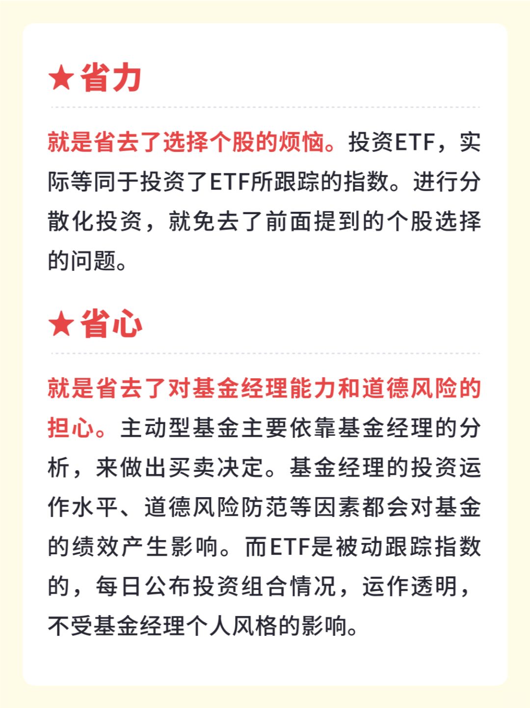 3⃣️省心,就是省去了对基金经理能力和道德风险的担心。主动型基金主要依靠基金经理的分析,来做出买卖决定。基金经理的投资运作水平、道德风险防范等因素都会对基金的绩效产生影响。而ETF是被动跟踪指数的,每日公布投资组合情况,运作透明,不受基金经理个人风格的影响。