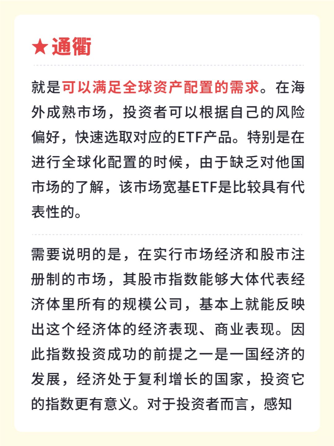 6⃣️通衢,就是可以满足全球资产配置的需求。在海外成熟市场,投资者可以根据自己的风险偏好,快速选取对应的ETF产品。特别是在进行全球化配置的时候,由于缺乏对他国市场的了解,该市场宽基ETF是比较具有代表性的。