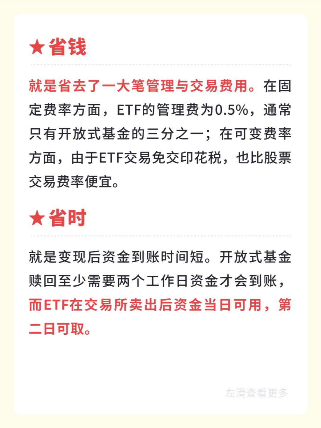 4⃣️省钱,就是省去了一大笔管理与交易费用。在固定费率方面,ETF的管理费为0.5%,通常只有开放式基金的三分之一;在可变费率方面,由于ETF交易免交印花税,也比股票交易费率便宜。
