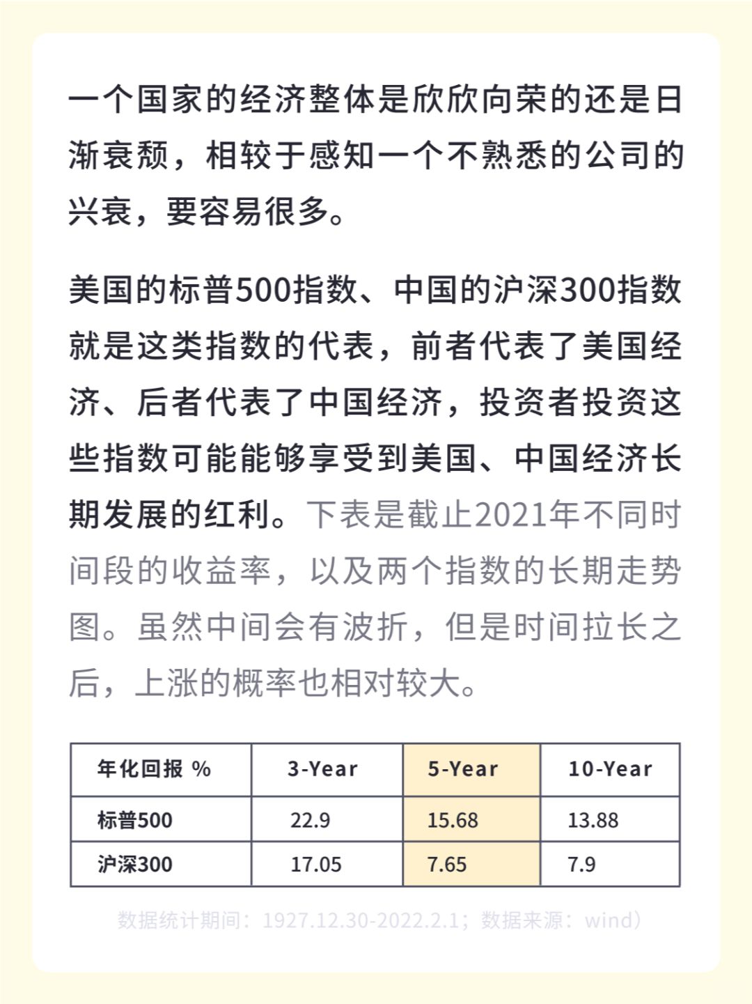 [吧唧R]需要说明的是,在实行市场经济和股市注册制的市场,其股市指数能够大体代表经济体里所有的规模公司,基本上就能反映出这个经济体的经济表现、商业表现。因此指数投资成功的前提之一是一国经济的发展,经济处于复利增长的国家,投资它的指数更有意义。对于投资者而言,感知一个国家的经济整体是欣欣向荣的还是日渐衰颓,相较于感知一个不熟悉的公司的兴衰,要容易很多。