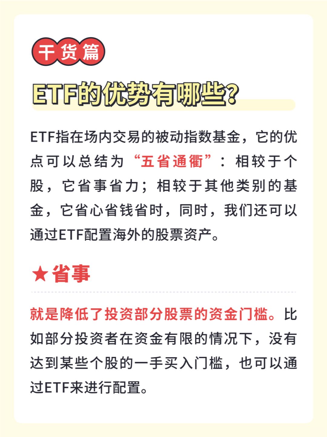 1⃣️省事,就是降低了投资部分股票的资金门槛。比如部分投资者在资金有限的情况下,没有达到某些个股的一手买入门槛,也可以通过ETF来进行配置。
