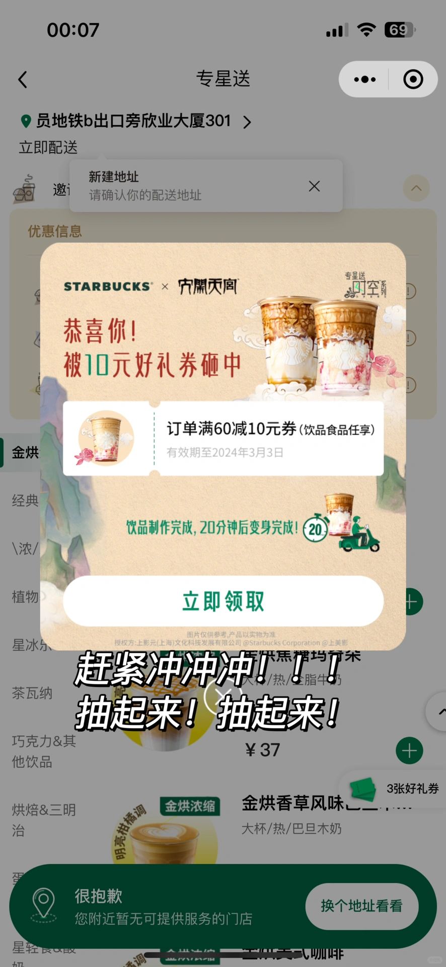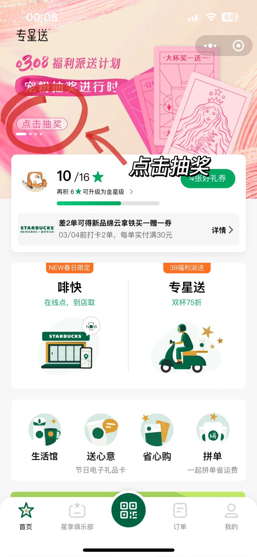 答应我!任何人错过星巴克大促我都会伤心ok?! 3.2-3.8!去星巴克app+小程序抽奖有机会1r大杯新品、新品买一送一、60-10券!! 券有效期3.4-3.8仅专星送可用,3.4-3.8还免运费!!冲啊🐛拼的就是一个手气,姐妹们不要错过~
