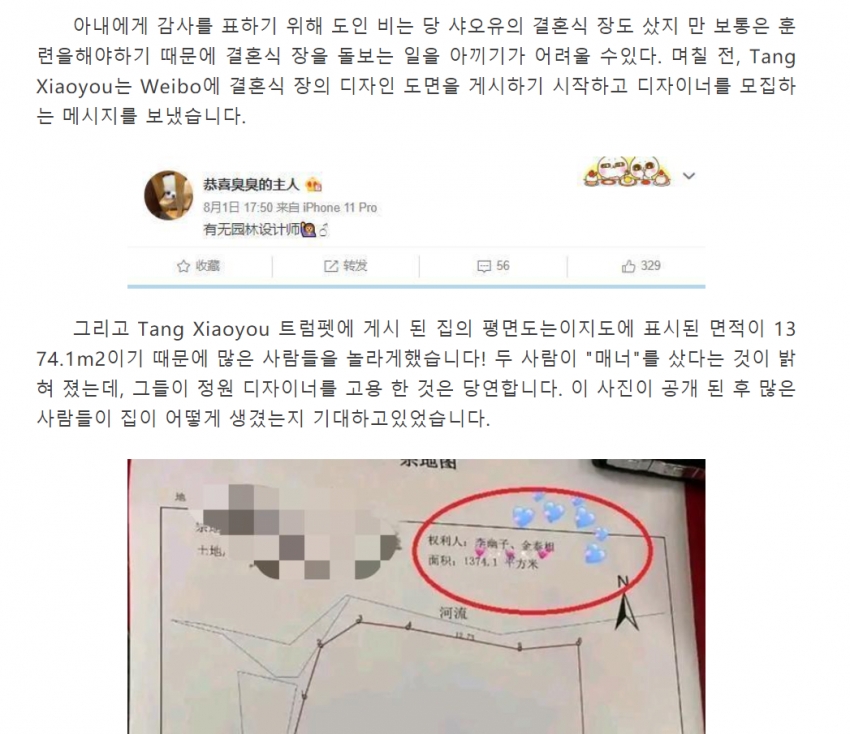 后续该韩国网友结合糖小幽此前的微博举例:“早年Doinb和糖小幽的新房设计信息泄露,面积高达1374平方,当时还招募设计师来设计、管理园林。”